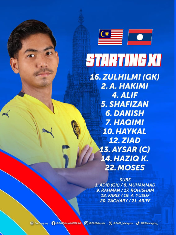 U22 Malaysia: Sharani Zuhilmi, Aysat Hadi, Aiman Hakimi, Ahmad Alis, Aeshad Shafizan, Sahal Kahimi, Hamimi Azim, Harry Danish, El Basheer, Ahmad Haziq, Mosees.