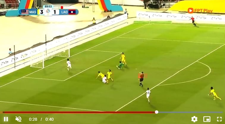 Bàn thắng! U22 Malaysia 4-1 U22 Lào! Trong pha phản công nhanh, Rohisham Haiqal phá bẫy việt vị xâm nhập vòng cấm dứt điểm bị thủ môn Kop Lokphathip cản phá, đồng đội Muhammad Khalil lốp bóng vào khung thành trống.