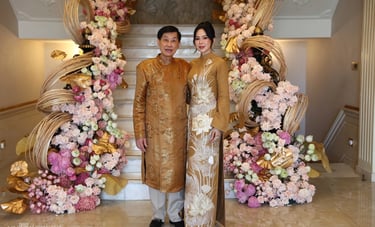 Vợ chồng doanh nhân trong nhà riêng. Không gian lễ gia tiên của con gái họ được trang trí bởi hoa tươi và tre, mây, bàn ghế gỗ