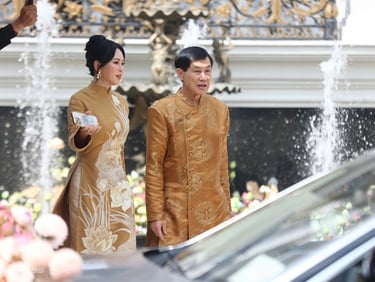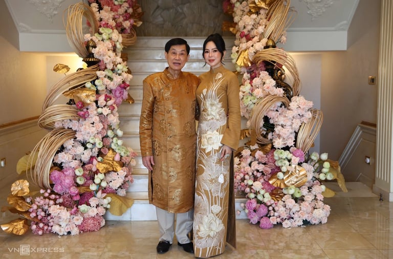 Diễn viên Thủy Tiên (trái) và chồng Johnathan Hạnh Nguyễn diện áo dài thêu sen màu nâu trong lễ gia tiên của con gái. Trang phục của cô dâu, chú rể và nhà gái do nhà thiết kế Minh Hạnh thực hiện.